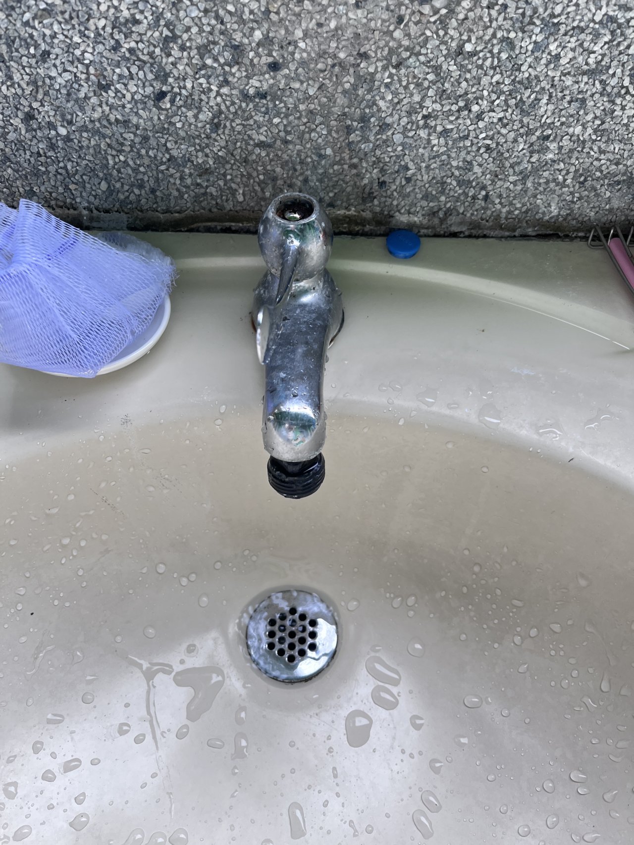 自然教室外的洗手台,最右邊的水龍頭無法關緊,有時還會發出高頻聲響。目前雖將背蓋翹起、鎖緊螺絲仍無法將水完全止住,可能是裡面的橡膠墊片老化導致。