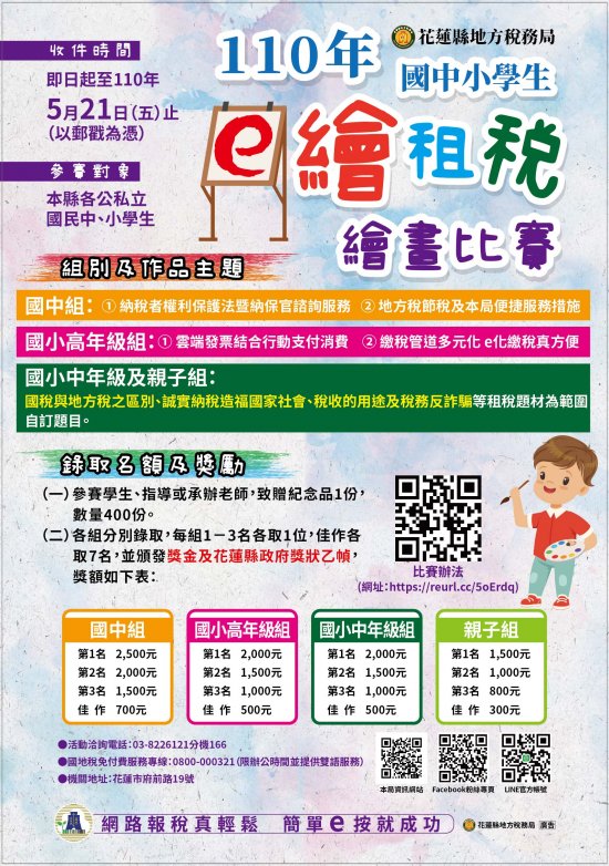 舉辦「e繪租稅」繪畫比賽,收件期間至本(110)年5月21日(星期五)截止,請學生把握時間踴躍參加。