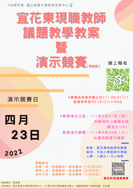 轉知國立東華大學教育與潛能開發學系李真文副主任辦理110學年度地方教育輔導計畫之【議題教學培力推廣】子計畫活動,報名及繳件時間延長,請轉知並鼓勵所屬教師踴躍報名參加,請查照。