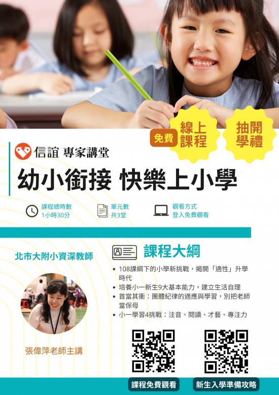 二、為幫助今年即將升小一的孩子順利銜接小學生活,信誼基金會提供線上課程「做好幼小銜接 快樂上小學」讓新生家長免費觀看,由北市大附小資深教師張偉萍主講,透過3堂課程帶爸媽認識小學世界,陪伴孩子上小學。三堂課主題如下: