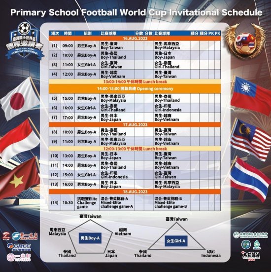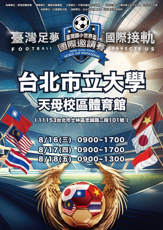 為推展國民小學足球運動,提升國內國民小學足球水準與視野,與國際接軌增加臺灣足球國際能見度、增進國際友誼,本會將於112年08月16日至112年08月18日假臺北市立大學天母校區體育館舉辦旨揭活動,宣傳海報及賽程圖如附件一、二,歡迎各校一同來參與觀賽。