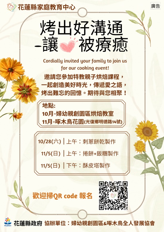 | 四、 | 有任何問題歡迎來電詢問,花蓮縣家庭教育中心欒小姐,電話03-8569692。 |
