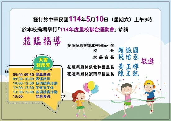 北林國小於5月10日(星期六)辦理114年度里校聯合運動大會,邀請您一同歡樂動一動!!