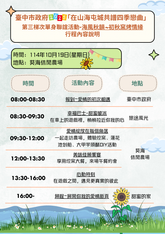 二、 本年度第三梯次單身員工聯誼活動原訂於10月25日(星期六)舉行,為配合紀念日及節日實施條例制定公布,爰調整至10月19日(星期日)辦理。茲將第三、四梯次相關報名訊息摘要如下: