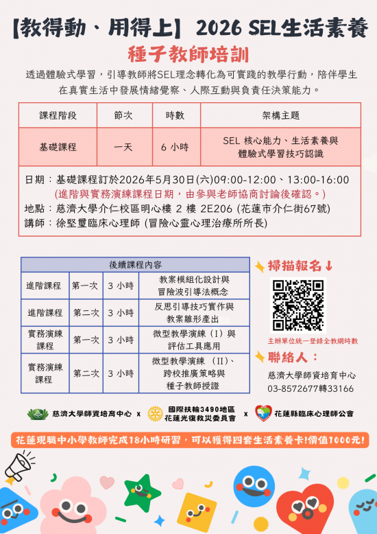 四、依實際出席時數,將協助登錄全國教師在職進修資訊網時數;另完整參加18小時培訓,可獲得種子教師證書及四套生活素養卡。