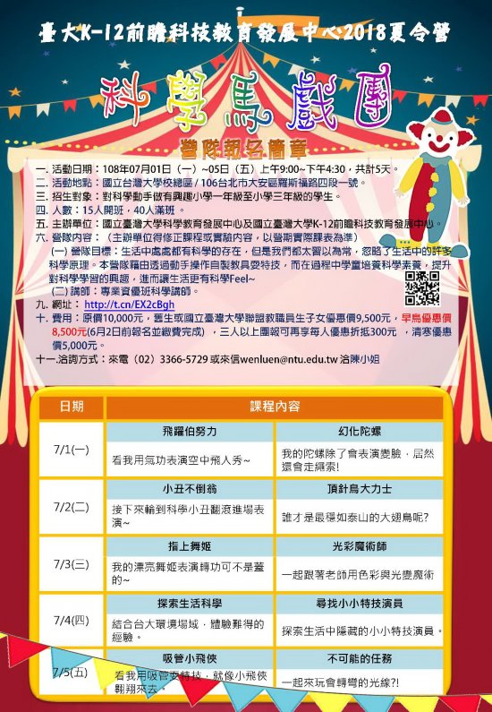 二、國立臺灣大學科學教育發展中心與K-12前瞻科技教育發展中心為推動科學動手做教育,提升中小學學生科學素養與科學視野,訂於今(108)年7月陸續開辦科學營隊活動。