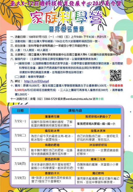 (三)108年7月15日(星期一)至19日(星期五):家庭科學營(報名網址http://t.cn/EX2uoyd)。