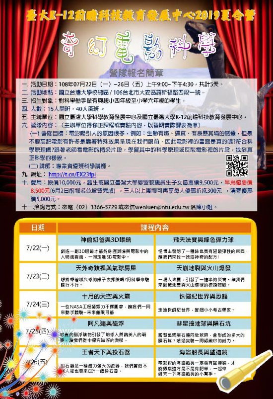 (四)108年7月22日(星期一)至26日(星期五):奇幻電影科學(報名網址http://t.cn/EX23fpi)。
