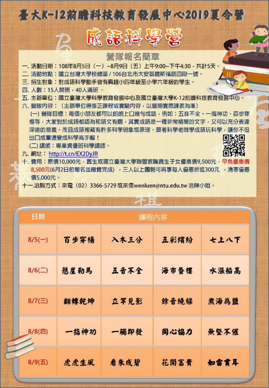 (六)108年8月5日(星期一)至9日(星期五):成語科學營(報名網址http://t.cn/EX2DyJR)。