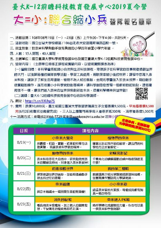 (七)108年8月19日(星期一)至23日(星期五):大=小:聯合縮小兵(報名網址http://t.cn/EXLhp7S)。