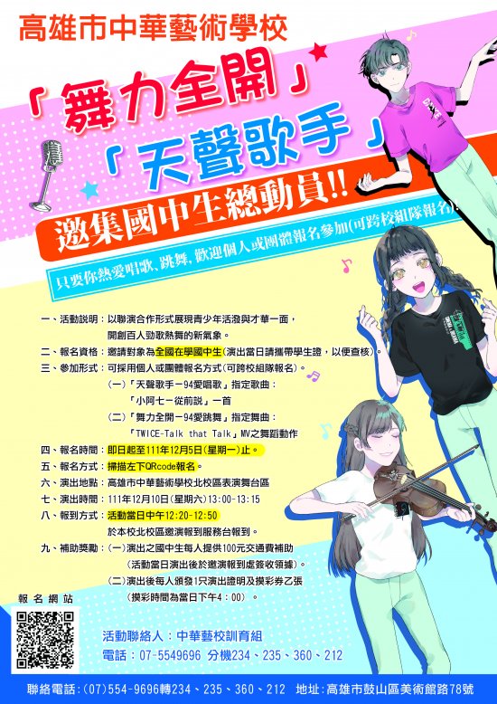 | 四、 | 本案聯絡人:中華藝校訓育組(電話:07-5549696分機234、360、235、212)。 |