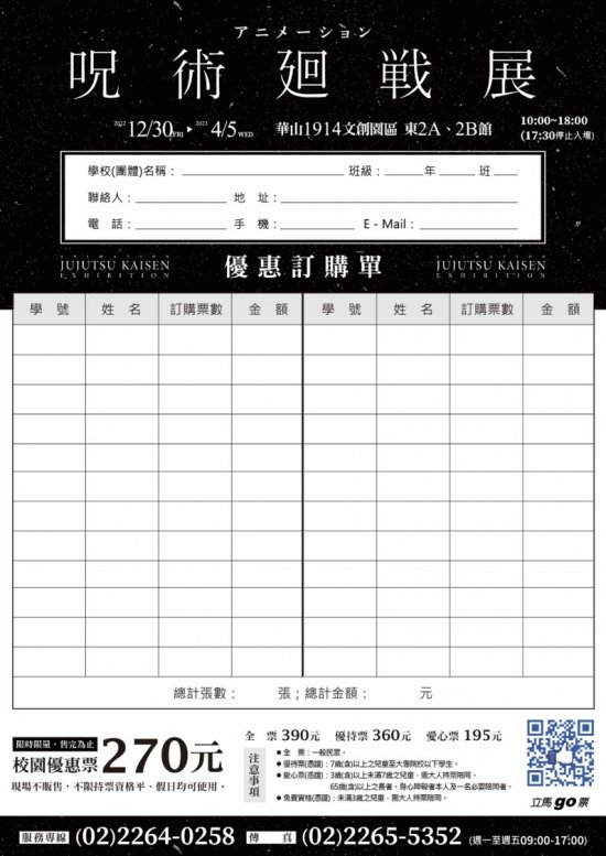 | 一、 | 為充實國人文化藝術視野、推廣動畫教育、增進國際教育的深度與廣度,本公司特引進日本超人氣漫畫「咒術迴戰」展覽。「咒術迴戰」自2020年改編動畫後引爆全球熱潮,成為現象級動畫大作,於日本巡迴展內容分兩期展出,本次「咒術迴戰展」海外特展集結所有作品,一次完整呈現給台灣觀眾,期待透過包含數百幅原畫、分鏡圖、等身FRP、巨型動畫投影及名場還原等豐富展品,一窺圖像授權產業成功背後的密訣! |