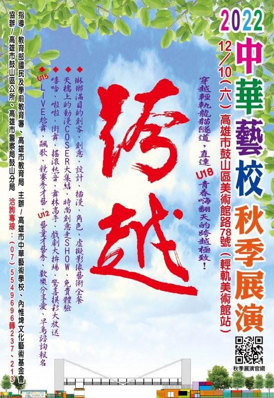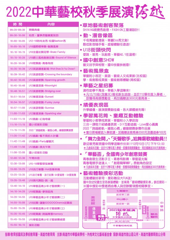 | 三、 | 檢附2022中華藝術學校秋季展演活動DM乙份,敬請惠予張貼宣導。 |
