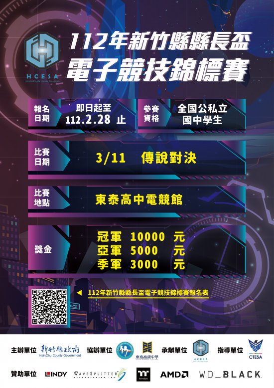 二、主辦單位:1.指導單位:中華民國電子競技運動協會。2.主 辦單位:新竹縣政府。3.承辦單位:新竹縣體育會電子競技 委員會。4.協辦單位:新竹體育會、東泰高級中學。5.贊助 單位:林帝股份有限公司、威世波股份有限公司、曜越科 技、超微半導體、威騰電子。