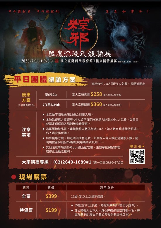 二、「粽邪 驅魔沉浸式體驗展」展覽訊息如下: (一)展覽時間:112年7月1日(周六)起至112年9月3日(周 日) (二)展覽地點:臺北市 國立臺灣科學教育館7樓東側特展區 (三)展覽介紹: 1、金獎電影《粽邪》系列經典場景獨家打造,民眾以 「送煞人」身份參加台灣傳統宗教禁忌「送肉粽」儀 式,更能一睹馗爺大戰鬼師父的刺激場面,今夏必去 的沉浸式體驗展! 2、還原恐怖電影場景及劇情,融合5G科技帶來的沉浸式 互動,虛實之間,刺激每一寸感官神經,感受前所未 有的恐懼! 3、一票玩滿A館「送肉粽—觸犯禁忌」、B館「鬼師父地 獄門—靈界探險」雙主題恐怖體驗。 4、首度公開《粽邪》電影第一手幕後製作資料與道具, 一窺電影誕生的艱辛過程!