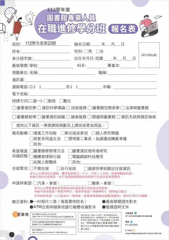 | 六、 | 檢附招生簡章、報名表、繳費流程說明,意者請於112年8月28日前,將報名表、相關證明文件及繳費收據影本寄交國立中山大學圖書與資訊處知識創新組黃小姐收。 |