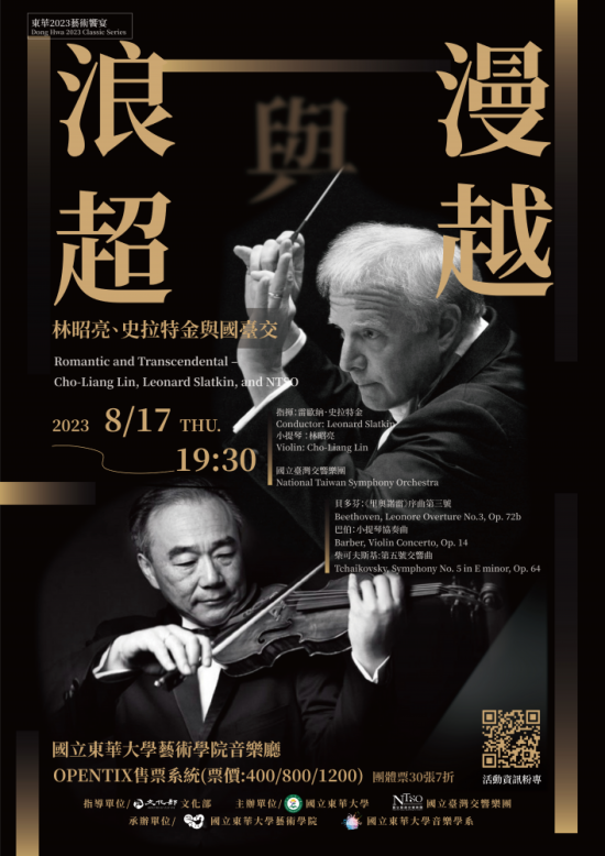 一、國立東華大學藝術學院與音樂系精心策畫,由享譽國際樂 壇的臺裔小提琴家林昭亮與美藉指揮家史拉特金和國立臺 灣交響樂團同台獻藝,演出巴伯的小提琴協奏曲,柴可夫 斯基的第五號交響曲。名家聯袂登台,花蓮閃耀登場,讓 您耳目一新,絕對值回票價!東華2023經典音樂饗宴,為 您增添璀璨時光!