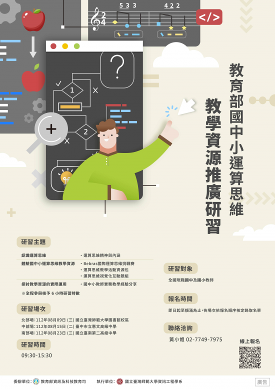 | 二、 | 旨揭計畫為推廣國中小運算思維教學資源與運用策略,協助教師活用以幫助學生建立良好的運算思維及未來進行程式學習的基礎。 |