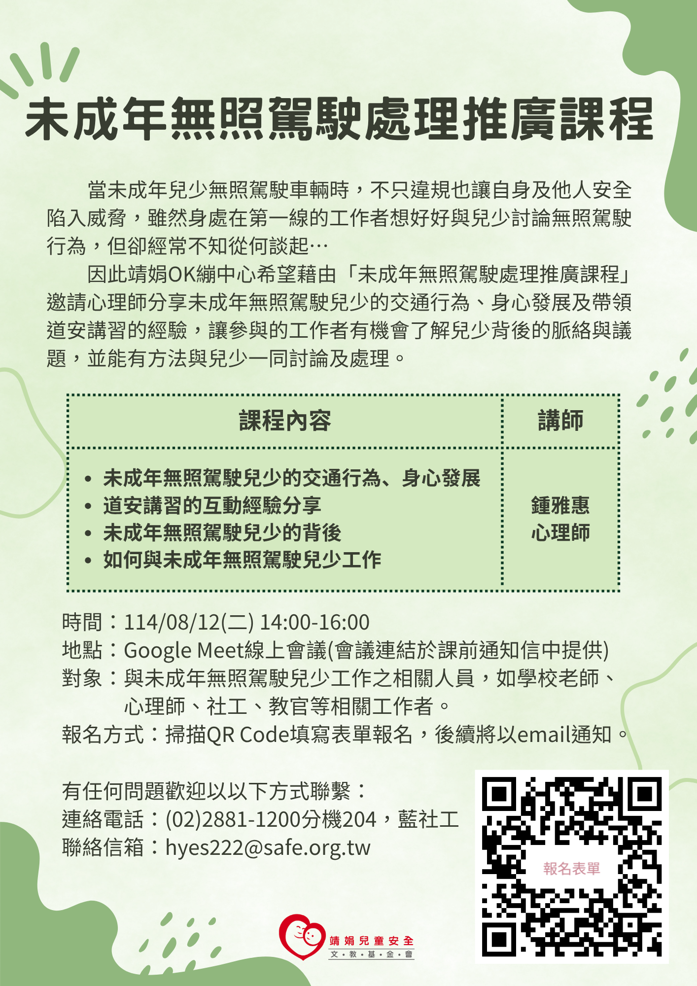 二、財團法人靖娟兒童安全文教基金會將於114年8月12日(星 期二)辦理「未成年無照駕駛處理推廣課程」分享未成年 無照駕駛兒少之交通行為、身心發展,以及道安講習的授 課經驗,讓兒少相關工作者了解未成年無照駕駛兒少,並 一同降低違規的發生。