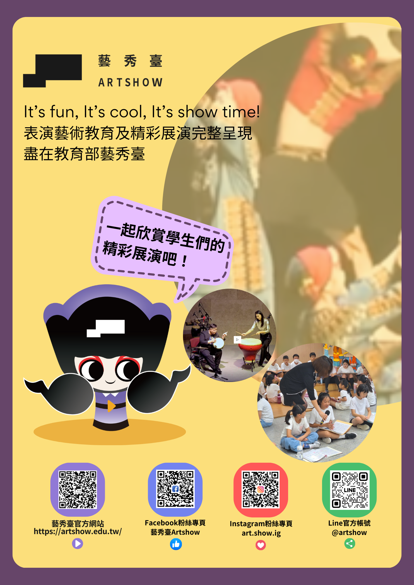 四、「藝秀臺」將持續提供優質展演及表演藝術教育推廣內 容,更多精采影片,請至「藝秀臺」網站,或至「藝秀 臺」臉書粉絲專頁:臉書搜尋「藝秀臺ArtShow」、官方 IG:搜尋「art.show.ig」關注即時訊息。 45
