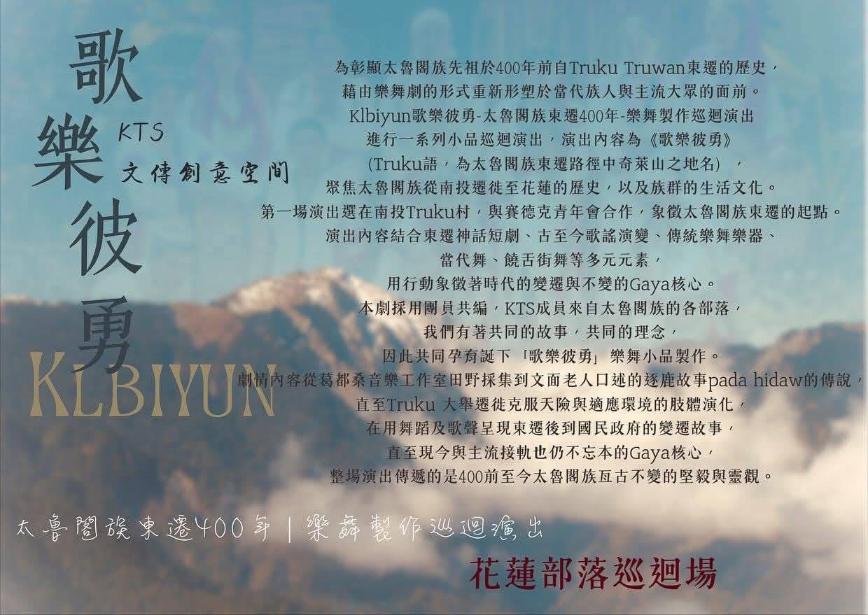 三、概述:為彰顯太魯閣族先祖於400年前自Truku Truwan東遷 的歷史,從南投遷徙至花蓮,以及族群的生活文化,協會 透過樂舞劇的形式,結合東遷神話短劇、古今歌謠演變、 傳統樂舞樂器、當代舞、饒舌街舞等多種元素重新呈現給 族人與主流大眾面前。