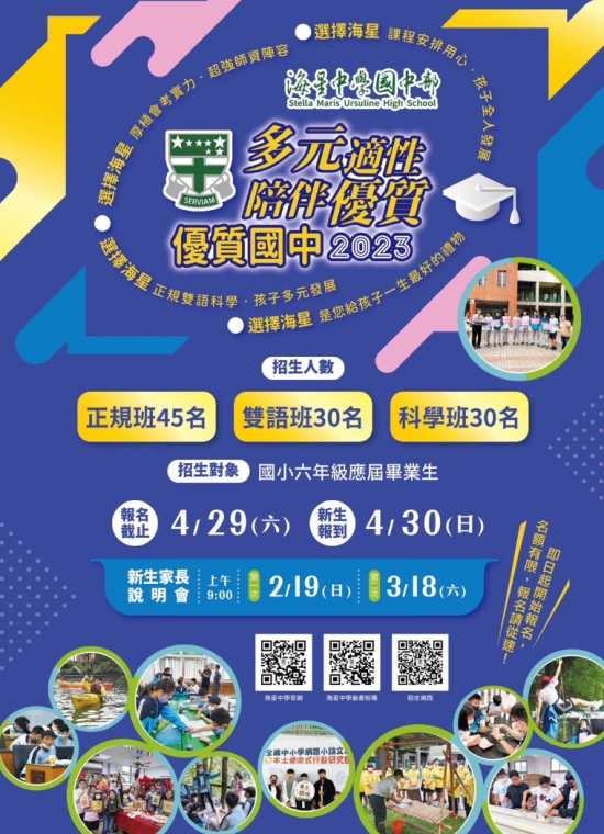 | 五、 | 其他相關資訊請參閱海星高級中學校網首頁「招生資訊」,或電詢海星高級中學國中部(03)824-2565、(03)824-2574。 |
