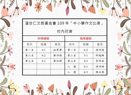 溫世仁文教基金會109年「中小學作文比賽」 校內初賽得獎名單