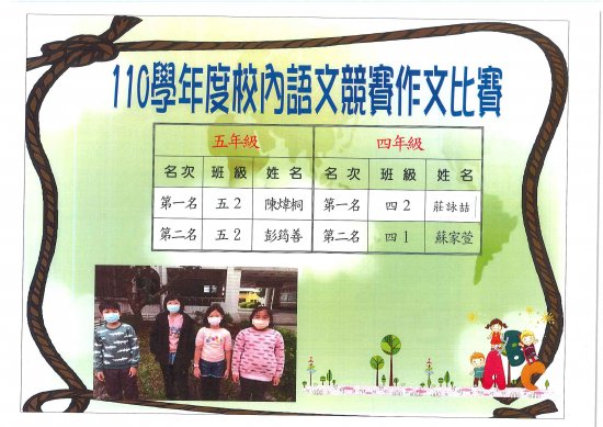 110學年度4-5年級校內語文競賽「作文比賽」得獎名單