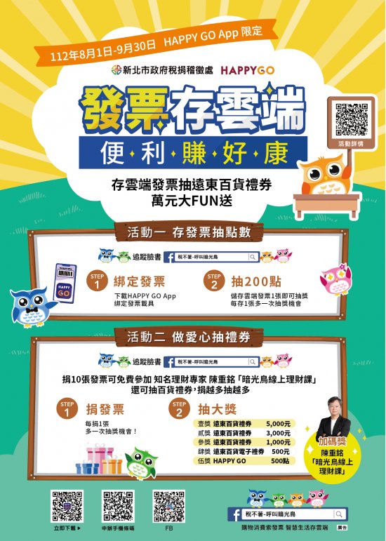新北市政府稅捐稽徵處於 112 年 8 月 1 日至 9 月 30 日與 HAPPY GO 合作舉辦「發票存雲端 便利賺好康」宣導活動,檢附活動 DM 電子檔(如附件)。