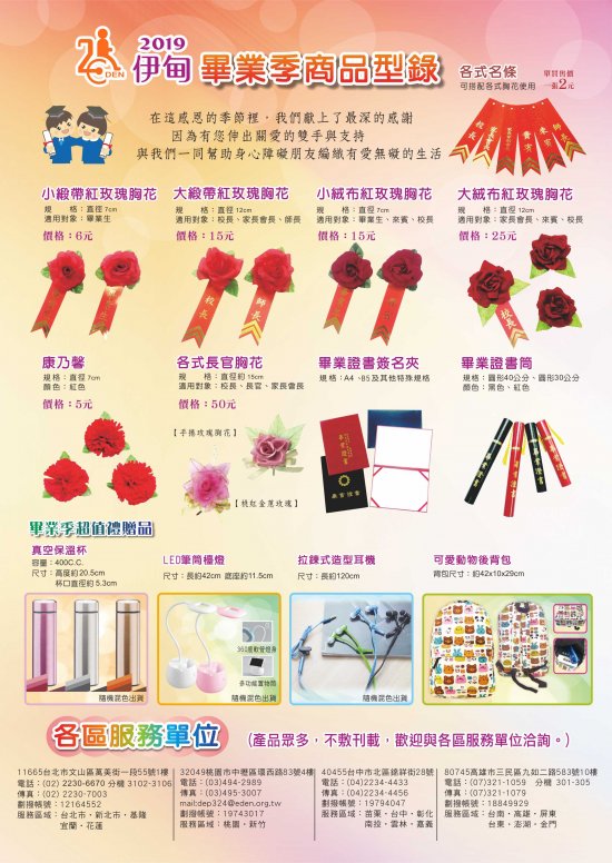 | 二、 | 該會為籌募「弱勢失能家庭服務」所需之推展經費,擬於本( 108 )年 4 月 1 日至 6 月 30 日舉辦「伊甸 108 年畢業季胸花及禮品」義賣活動募集。 |