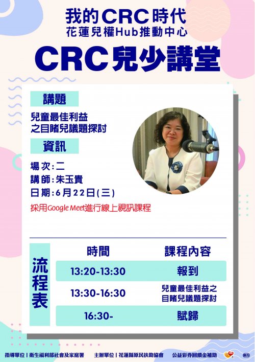 | 主旨: | 函送本會辦理衛生福利部-「我的 CRC 時代,花蓮兒權 Hub 推動中心」兒童權利公約教育訓練與提升兒少參與公共事務計畫-CRC 講堂,考量目前疫情嚴峻,為避免群聚之染疫風險, CRC 講堂由實體課程調整成線上課程辦理,協請貴單位公布課程資訊並派員參與,請查照。 |