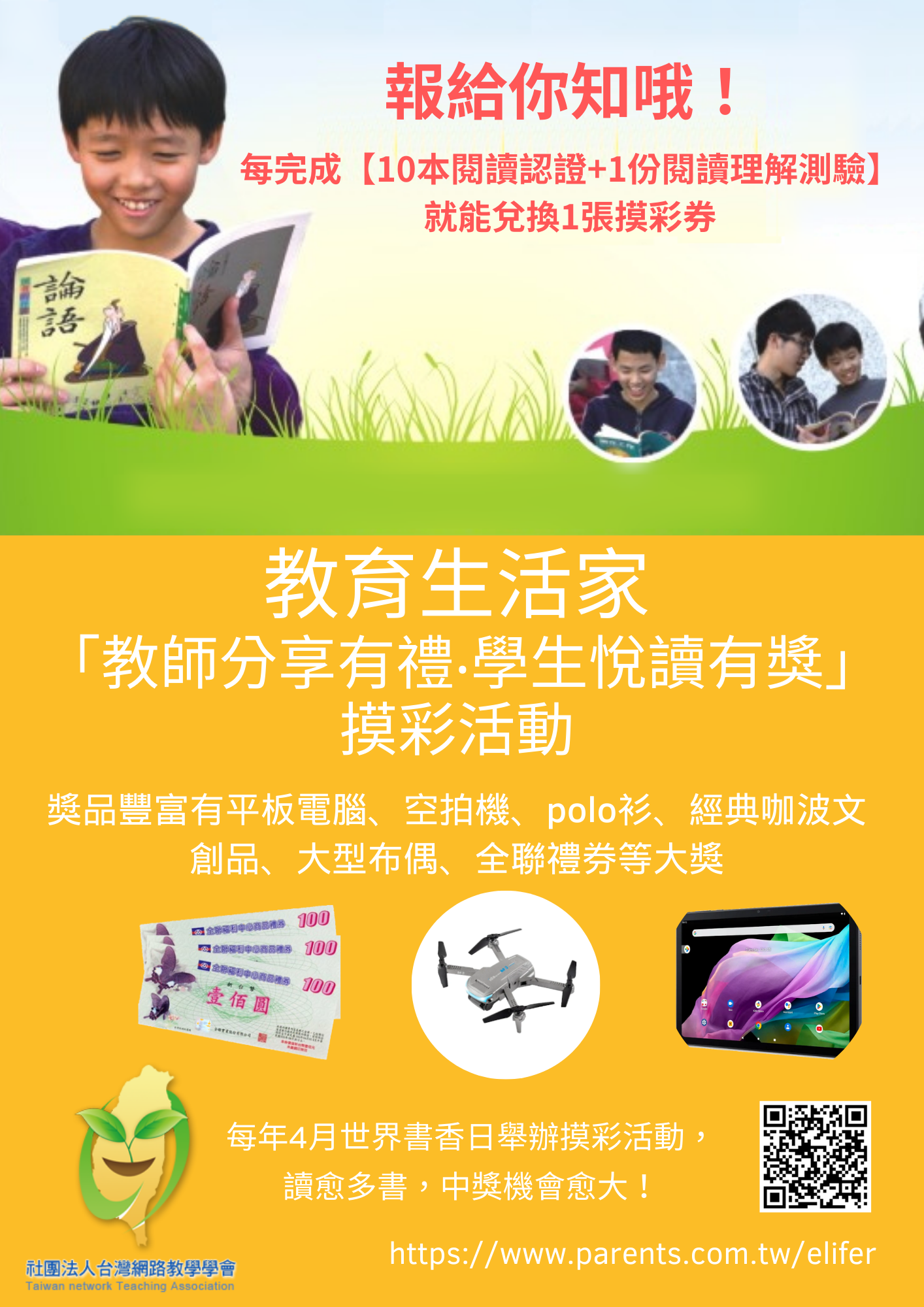 今年 4 月 23 日世界書香日「教育生活家」網站又要舉辦「教師分享有禮‧學生悅讀有獎」摸彩活動,