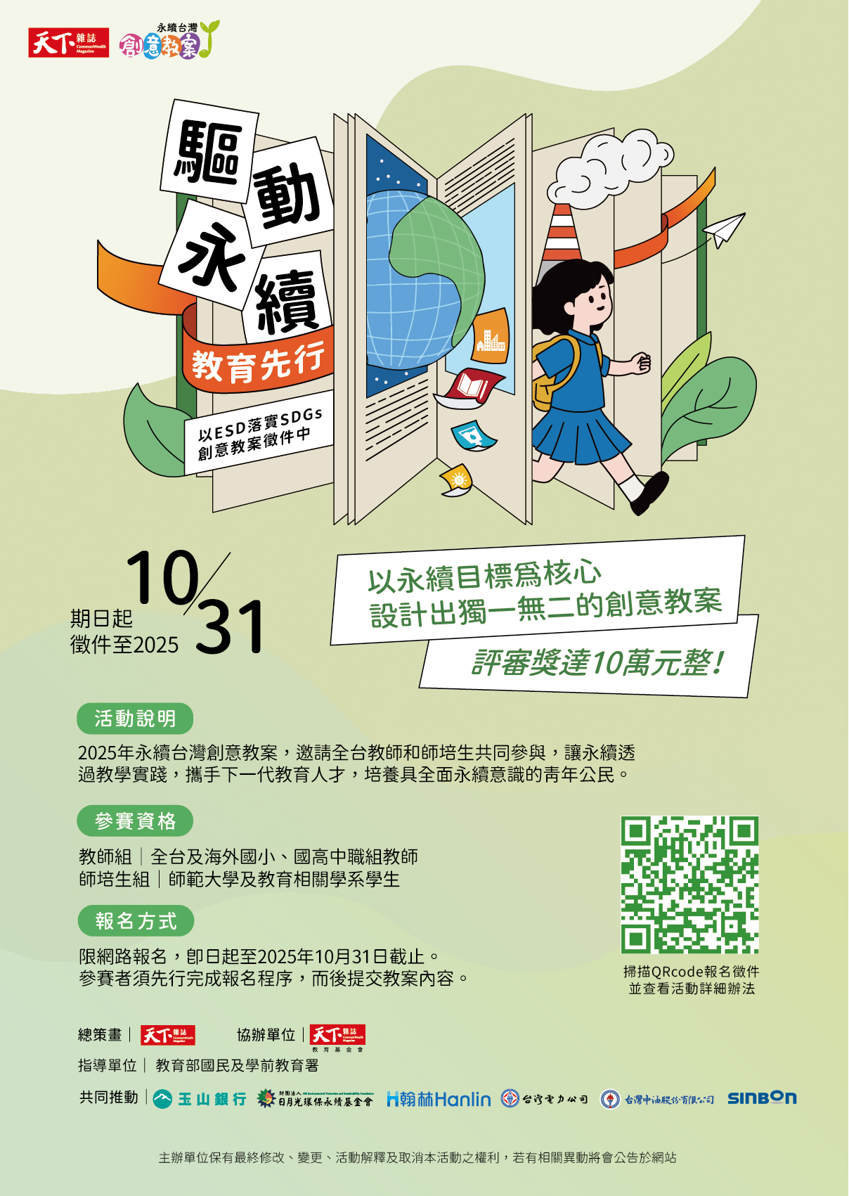 四、 提供活動網址 https://csr.cw.com.tw/lessonplan/、附件一 2025 創意教案活動辦法、附件二 2025 徵件海報,惠請各學校協助宣傳及刊登於校內網站。