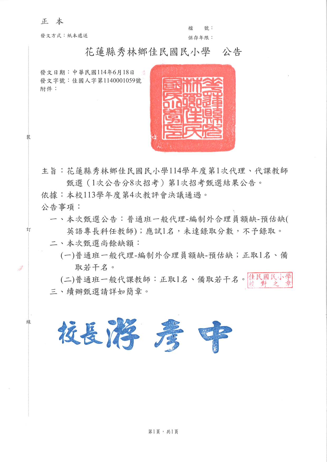 (一)普通班一般代理教師-預估缺(編制外代理教師缺、英語 專長科任教師):正取1名、備取若干名。