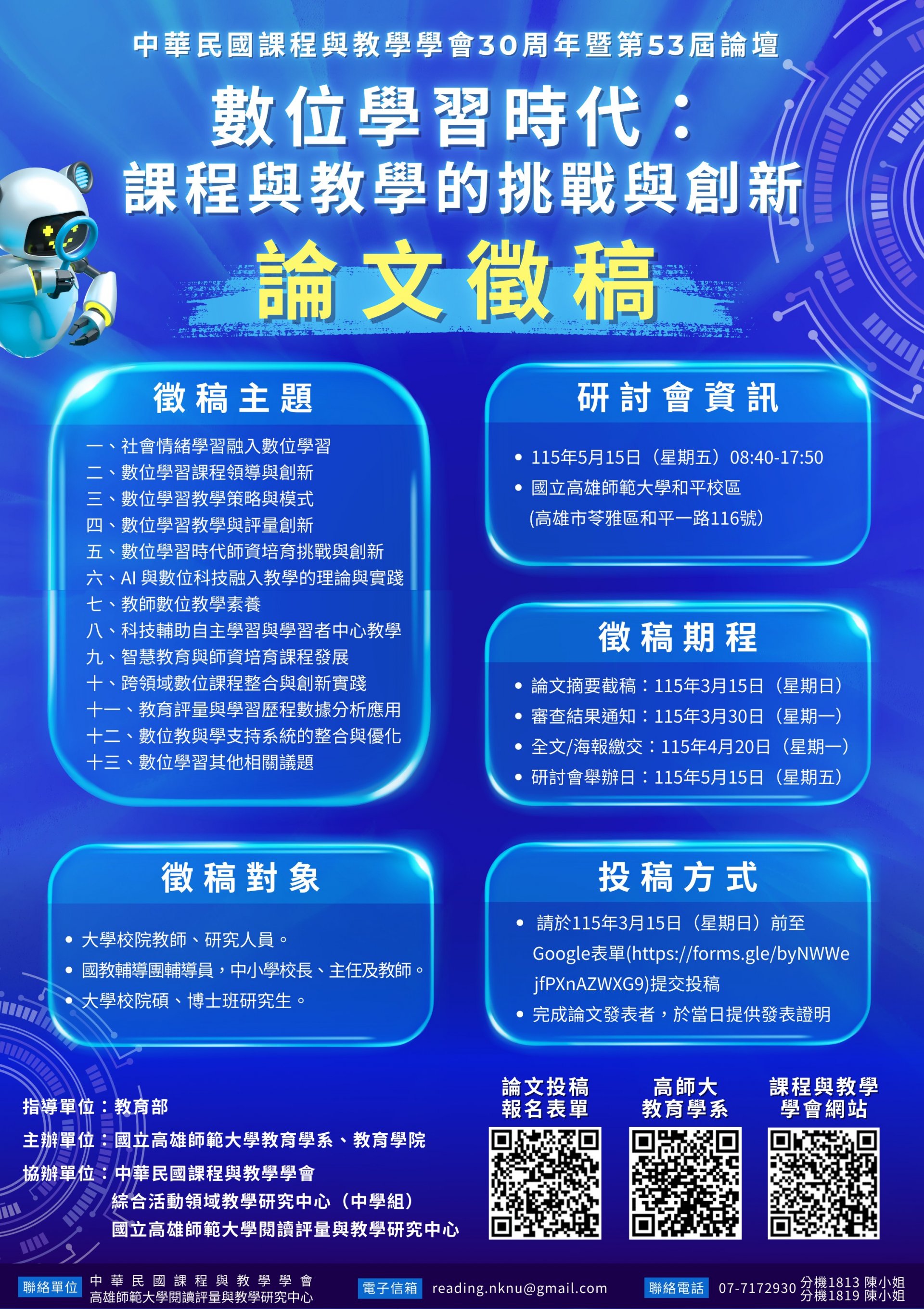 六、其他活動說明等相關資訊,請詳閱徵件公告或至國立高雄師範大學教育學系網站 https:115//c.nknu.edu.tw/edu/ 及中華民國課程與教學學會網站( https://811051206.wixsite.com/acitaiwan/refund-policy )瀏覽查詢。