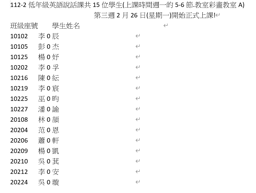 經抽籤過後 15 位同學參加低年級課輔英語說話課。