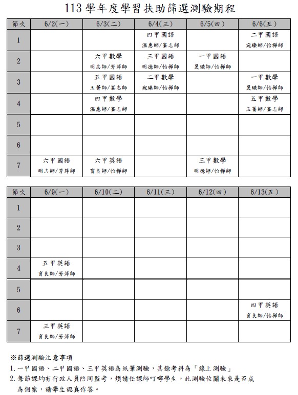 本學年度篩選測驗期程如下表,敬請各位老師及行政人員按表監考