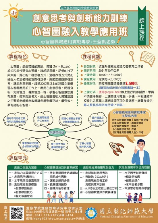 | 二、 | 「創意思考與創新能力訓練-心智圖融入教學應用班」課程時間為 110 年 10 月 3 日(日) 10:00-17:00 ,合計 6 小時,公務人員及教師可登錄研習時數,本課程為遠距直播互動課程,課程費用每人 3,600 元,贈教師出版心智圖書籍,防疫期間線上課程超值優惠方案每人 2,500 元。 |