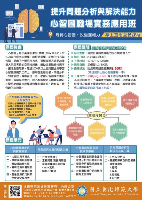 | 一、 | 「提升問題分析與解決能力-心智圖職場實務應用班」課程時間為 110 年 9 月 26 日(日) 10:00-17:00 ,合計 6 小時,公務人員及教師可登錄研習時數,本課程為遠距直播互動課程,課程費用每人 3,600 元,贈教師出版心智圖書籍,防疫期間線上課程超值優惠方案每人 2,500 元。 |