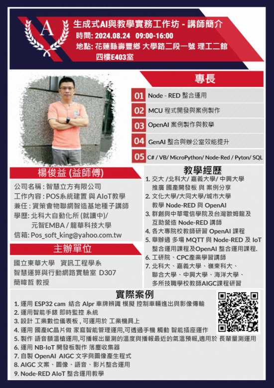 一、時間: 113 年 8 月 24 日星期六, 9 : 00-16 : 00 。 二、地點:國立東華大學理工二館四樓 E403 室 三、活動提供教師研習時數及中餐。 四、請上全國教師在職進修網報名,代碼 4473902 。 https://www1.inservice.edu.tw/index2-3.aspx 五、附件活動海報及講師介紹,歡迎轉發。