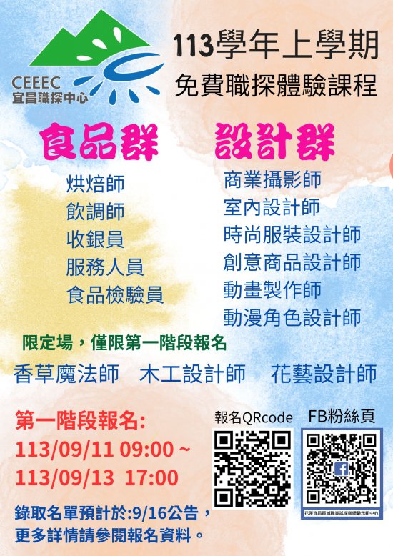 二、有意申請學校請致電洽詢宜昌職探中心徐堯琦老師、葉玟廷助理(電話: 03-8520803#506)