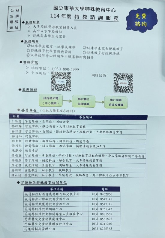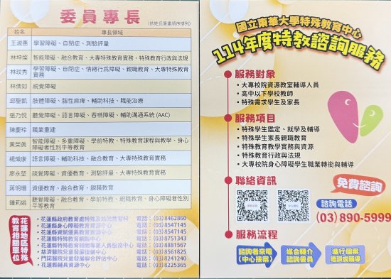 二、 本校特殊教育中心特聘學養豐富之特教學者及專業人員擔任諮詢委員。諮詢者來電後,由中心轉介媒合,安排個案諮詢晤談,請轉知普通班教師及家長多加善用。