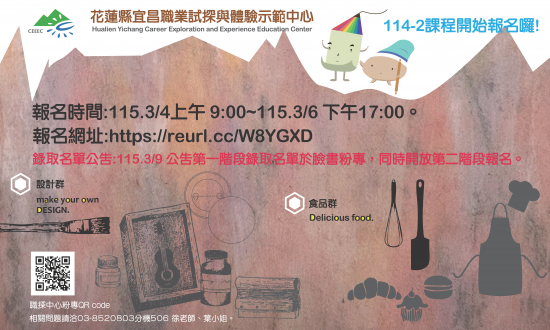 二、第一階段報名時間自 115 年 3 月 4 日 9 : 00 至 3 月 6 日 17 : 00 , 請逕至報名網址 https://reurl.cc/W8YGXD 進行報名作業, 或於「花蓮縣宜昌區域職業試探與體驗示範中心」粉專點 選報名連結,或掃描海報 QR code 報名。