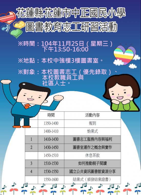 ※對象:本校圖書志工(優先錄取)、本校教職員工與社區人士。