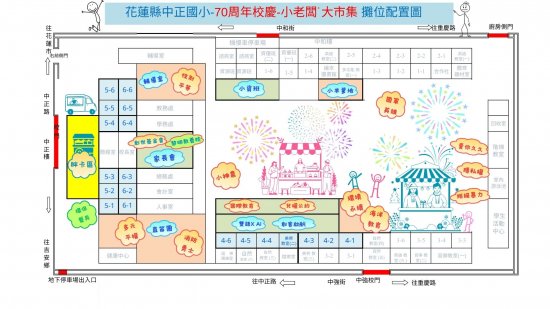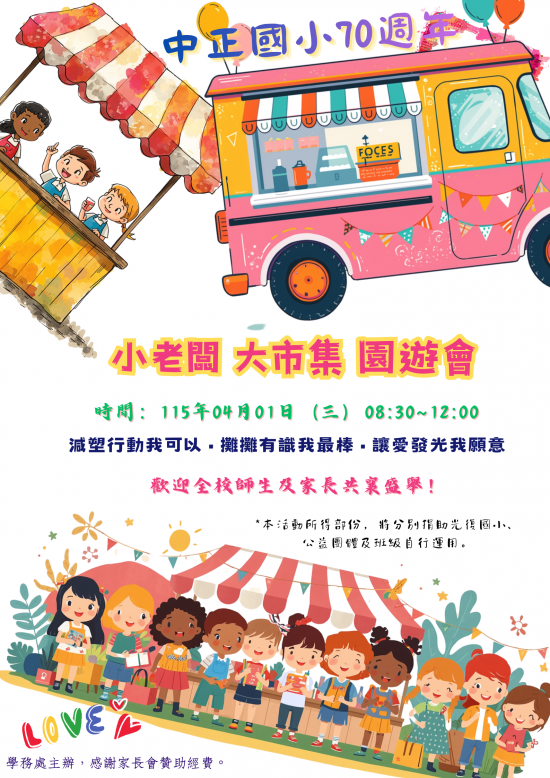 貼心小叮嚀 1 、響應減塑,當天請孩子攜帶餐具,現場也有環保餐具借用攤位(押金 100 元)。 2 、當天家長請勿將機車停進校園內。 3 、本活動 8:30~11:30 開放家長入校,中正小門、中強小門全程開放。 4 、垃圾不落地,一起當個好品格公民。