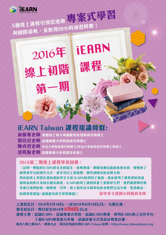 | 二、 | 費用包含: 5 週線上課程、並另含市價 450 元之「專案式學習手冊」及 150 元之「2015-2016 iEARN 專案手冊」各乙本以供學習使用。 |