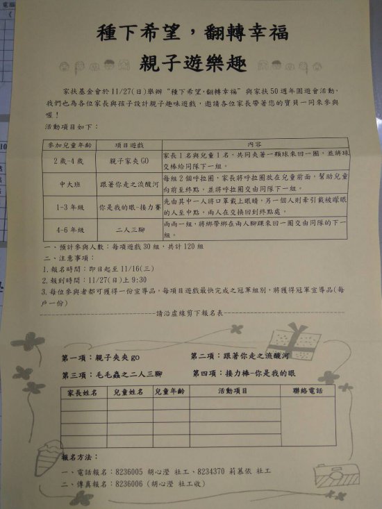 1.家扶基金會於 11/27(星期日)舉辦"種下希望,翻轉幸福,親子遊樂趣"活動,歡迎全校親師生踴躍參加(如附檔)
