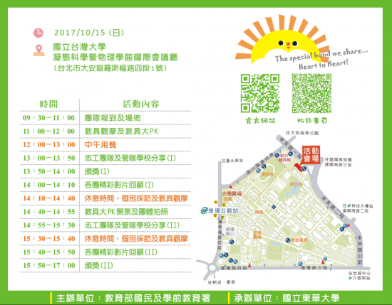 二、 本年度「2017 群英行腳~大專『英』樂夏令營」各校志工出隊服務已於 106 年 7 月 21 日前辦理完竣,為體恤志工們的辛勞,並讓社會大眾看見志工們的熱情活力為偏鄉國中小學童服務,該計畫將辦理成果發表會暨 2018 說明會。
