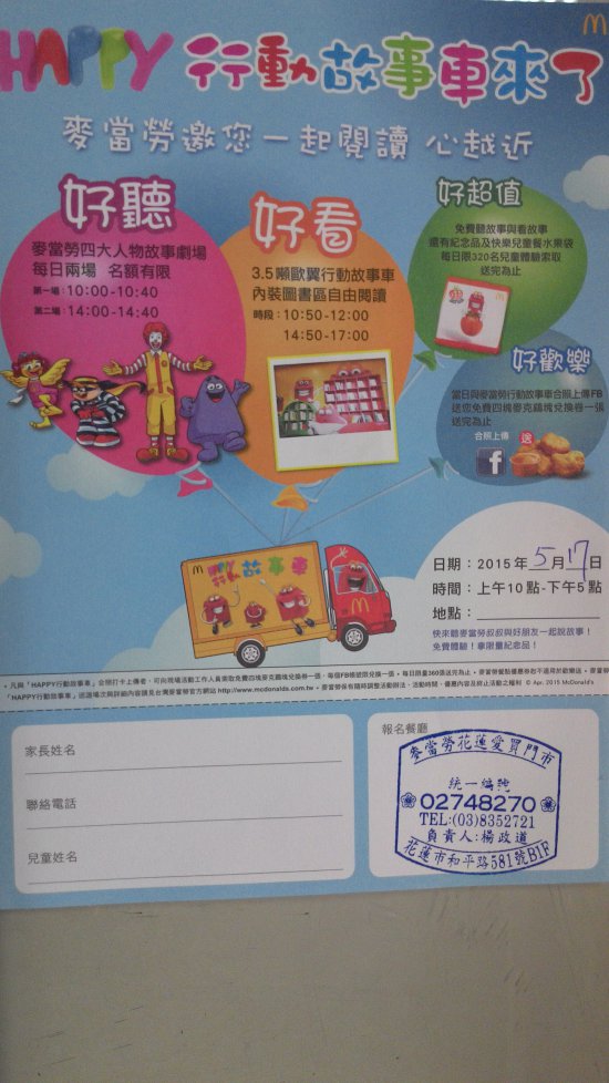 四、好歡樂:當日與麥當勞行動故事車合照上傳 FB ,送您免費四塊麥克雞塊兌換券一張。