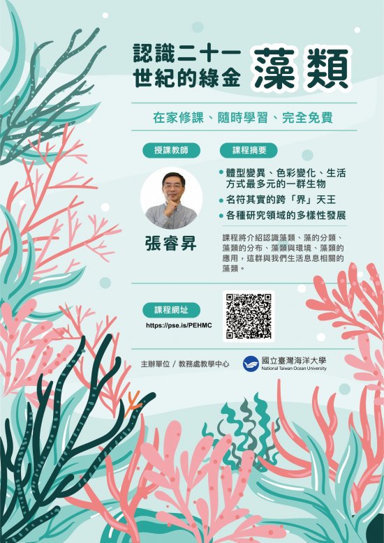 國立臺灣海洋大學 開設「【環境教育】認識二十一世紀的綠金-藻類」磨課師線上課程,認列「全國教師在職進修資訊網」研習時數 6 小時,請踴躍報名學習,請查照。